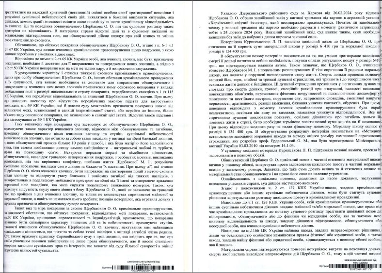 З 25 листопада 2025 року вирок у резонансній справі (провадження 638/15101/24) про жорстоке вбивство Олексієм Щербаковим його дружини Марії Холодної, зірки ХАТМК, вступив в дію. (Докладніше про вирок суду та хід розслідування в новинах GX).