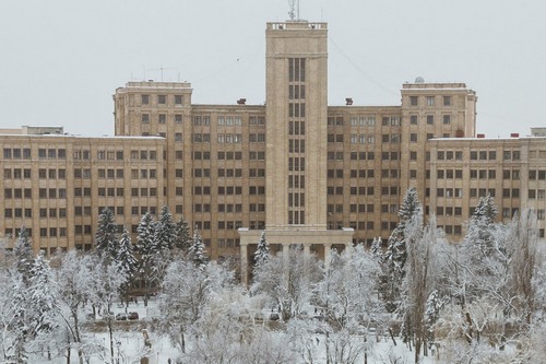 В наши дни универ “ютится” в двух небоскребах, возведенных во времена раннего “репрессанса”, в начале 30-х, изначально в стиле любимого харьковскими архитекторами конструктивизма, а затем переампиренных в 50-е. А было время, когда студенты и профессура размещались в губернаторском дворце.