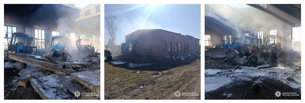 Унаслідок удару пошкоджено дах ангара, один навантажувач та три трактори. На місці виникла пожежа.