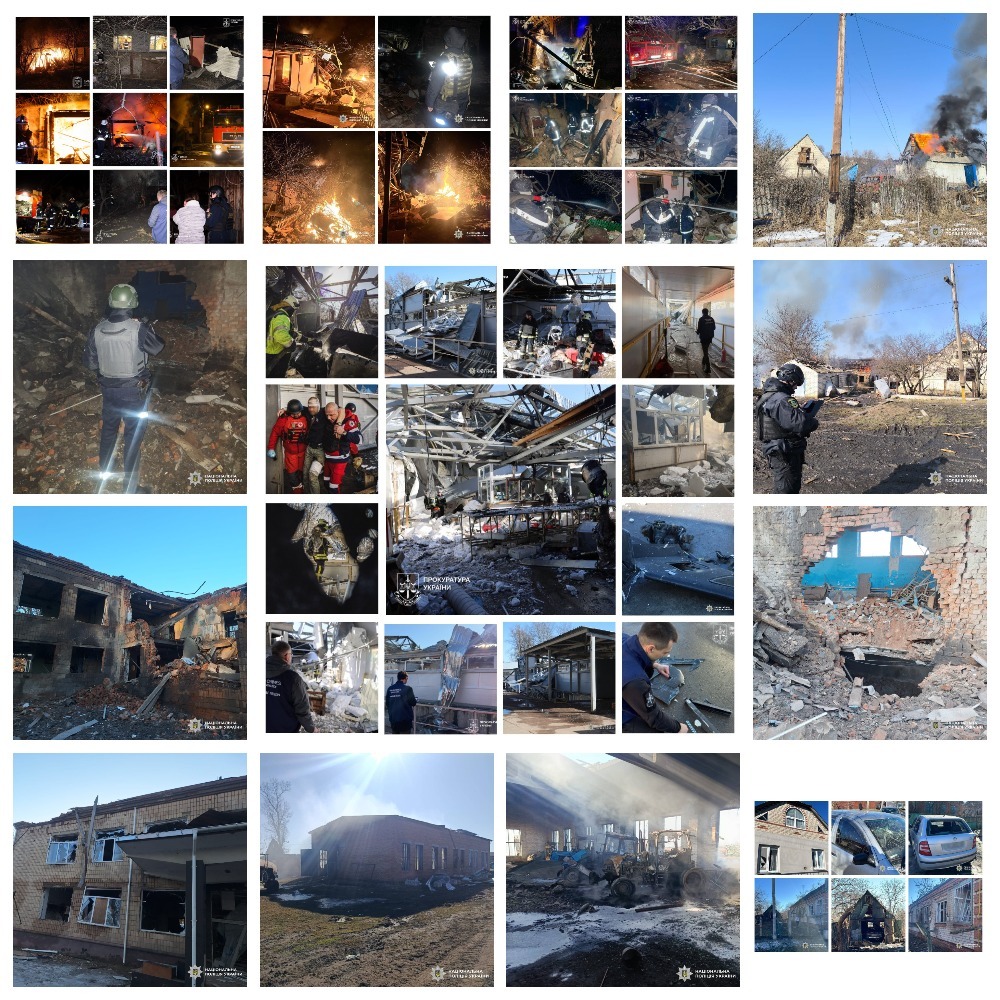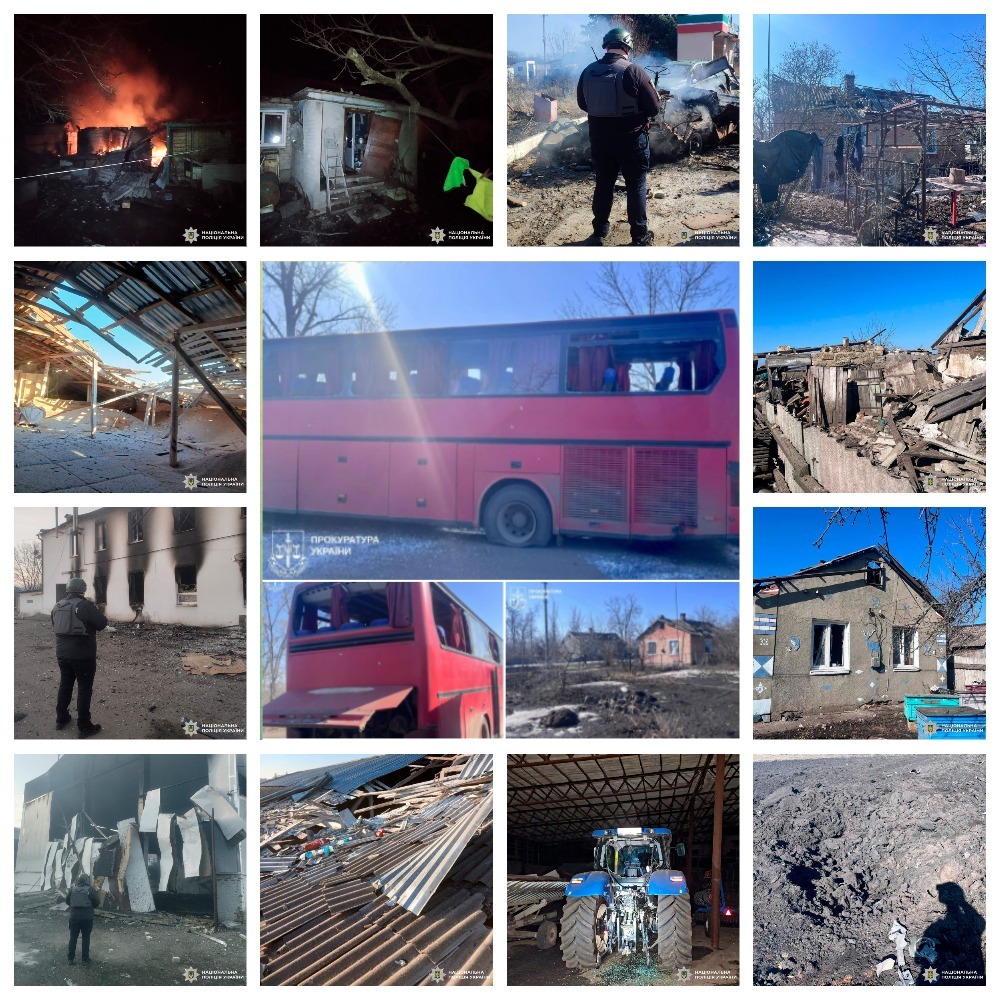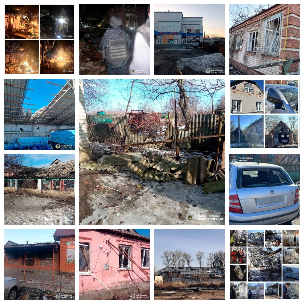 Зокрема, 12 березня у період з 04.10 до 05.00 російські військові завдали щонайменше восьми ударів безпілотниками по селищу Золочів Богодухівського району. Попередньо встановлено, що ворог застосував БпЛА типу «Герань-2», «Молнія» та FPV-дрони. Пошкоджено будинок культури, адміністративні будівлі, магазини, склади, а також техніку сільськогосподарського підприємства.