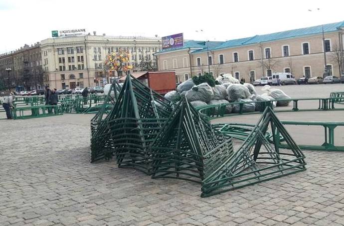 «На площади появились металлические конструкции для новогодней красавицы, а также “иголки” в мешках», – рассказал харьковчанин Олег.