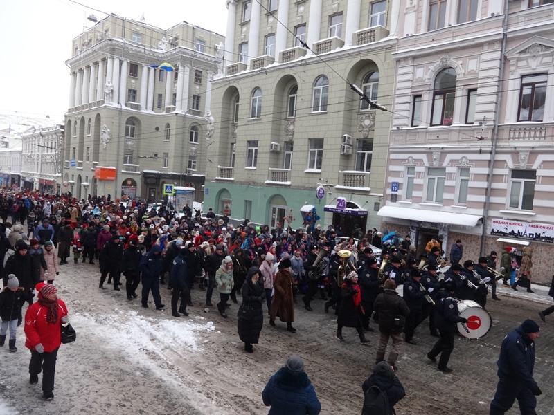 Дві колони артистів у різдвяних костюмах пройшли до Харківського національного театру опери та балету ім. М. Лисенка по вулиці Сумській (від площі Конституції та площі Свободи).
